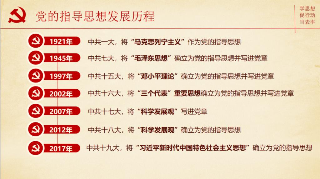 党的指导思想又称党的行动指南,是指导我们党全部活动的理论体系,是党的思想建设、政治建设、组织建设、作风建设、文化建设、制度建设和反腐倡廉建设的理论基础。