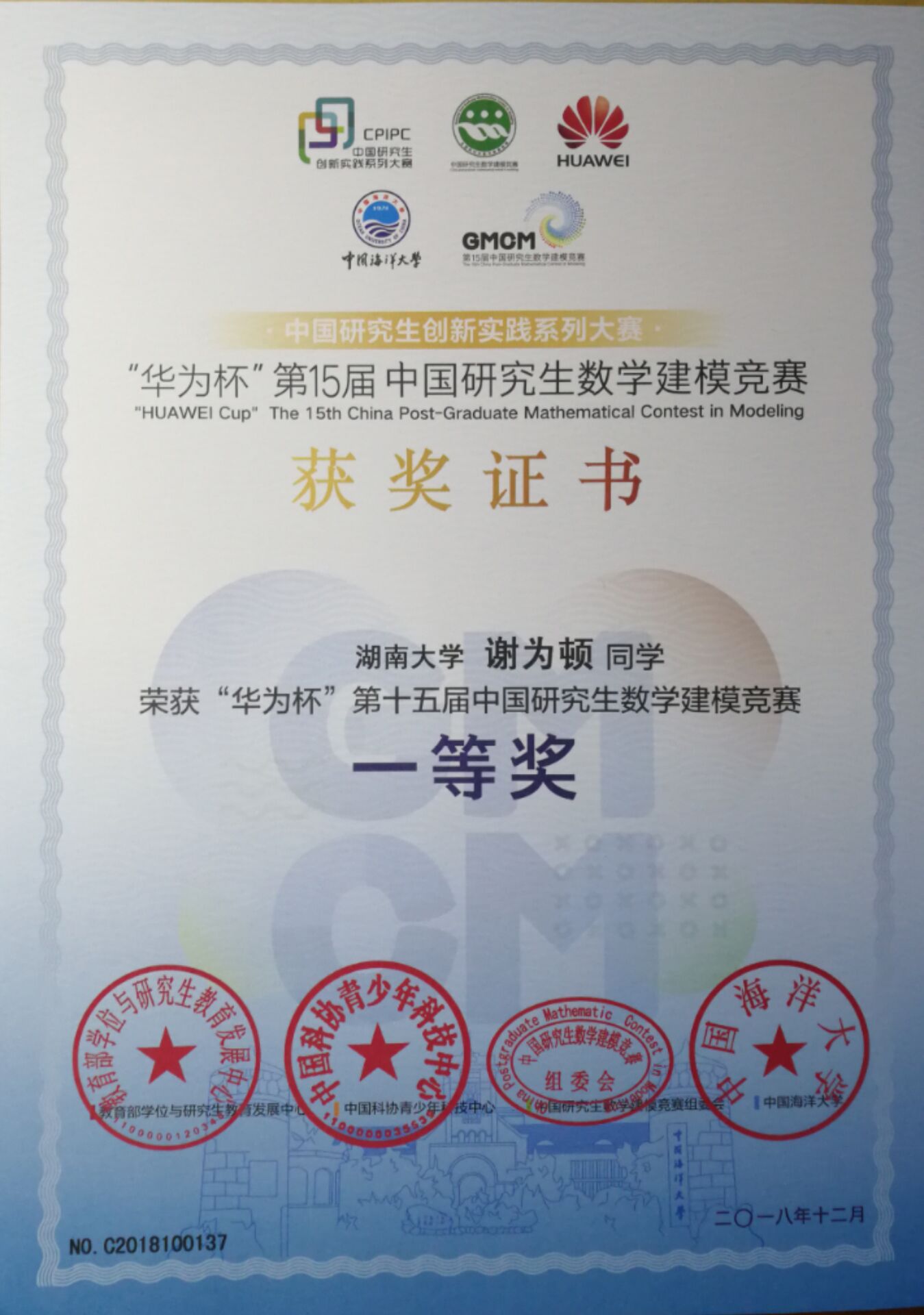 公司员工谢为顿所在参赛队喜获中国研究生数学建模竞赛全国一等奖