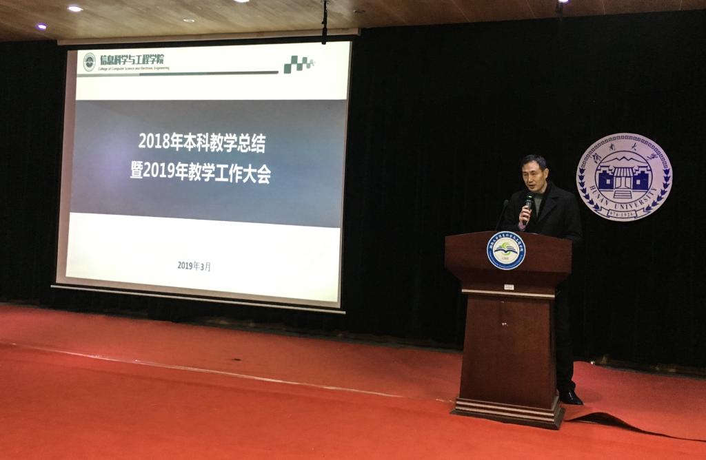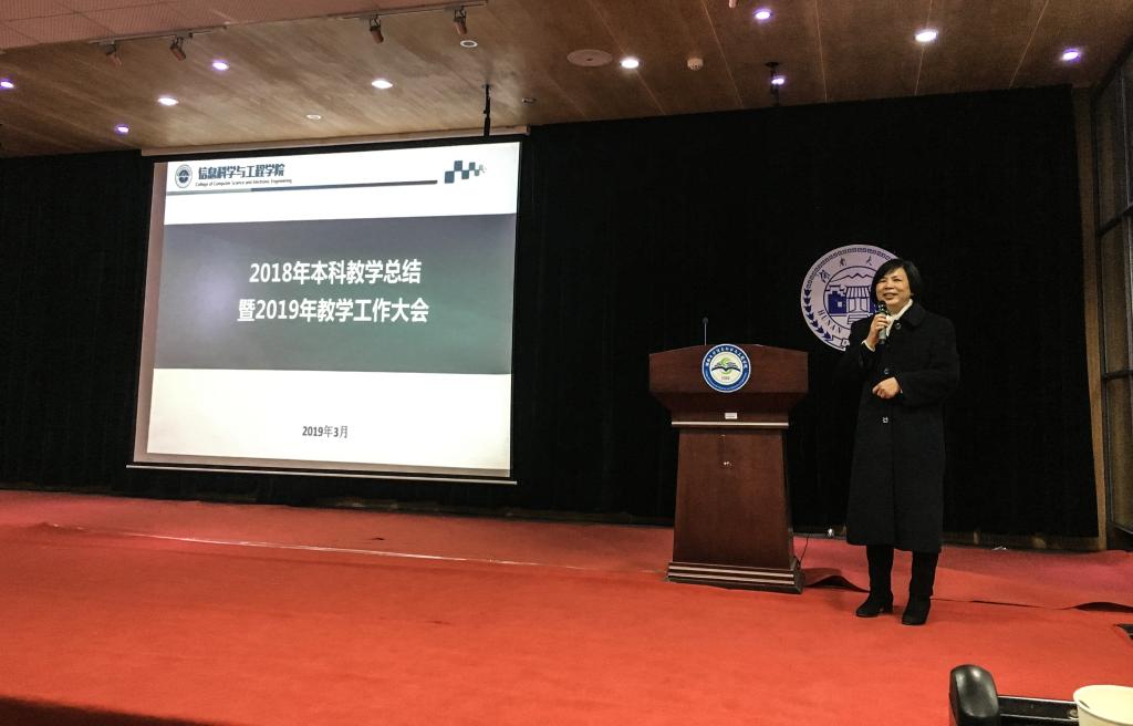 大会首先由经理助理罗娟教授作教学工作报告,报告全面回顾和总结了过去一年来公司本科教学的主要工作,围绕专业建设、课程建设、学科竞赛、创新创业等介绍了2018年教学工作主要成效,通信工程、物联网工程、信息安全三个专业通过工程教育专业认证,计算机科学与技术获湖南省首批专业综合评价全省第一,获得最高评价,新增立项国家级新工科研究实践项目,新增认定国家级精品在线课程等。同时结合新时代教育工作要求,对公司2019年教学重点工作进行了部署,提出对标一流建设一流专业,按照国家一流课程建设标准着力打造“金课”,强化专业课教学的“课程思政”建设、遴选建设一批“特色示范课堂”,通过课程评估形成持续改进的教学质量改进机制等。