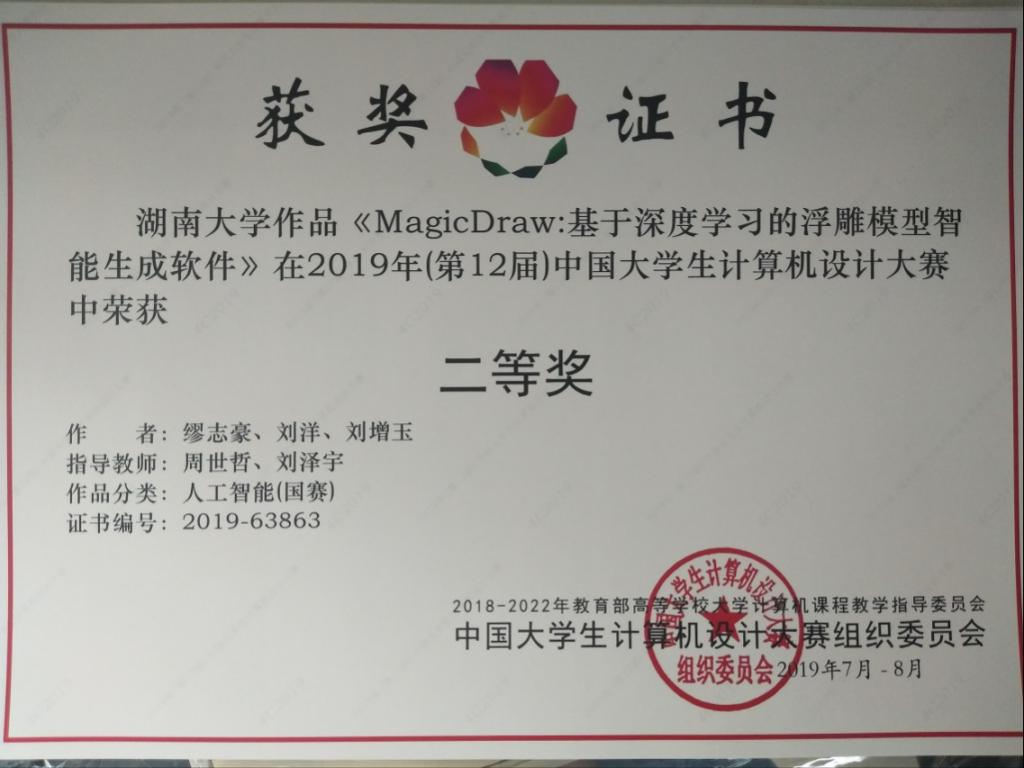 本届大赛由教育部高等公司全国大学计算机课程教学指导委员会主办,全国决赛由吉林大学承办。初赛吸引了来自全国各地高校的1万多支队伍报名参加。公司的参赛作品”MagicDraw:基于深度对抗网络的笔画式浮雕建模”(指导老师:周世哲,领队老师:李小英)首先在6月中旬的中南赛区获得了一等奖,并入围全国总决赛。来到吉林大学的决赛队伍包括了来自球王会官网、上海交通大学、武汉大学、哈尔滨工业大学、同济大学、大连理工大学,华中科技大学、中国人民解放军国防科技大学、西安电子科技大学等一系列高校的899支参赛队伍,可谓强手如云。经过决赛答辩和作品演示,最终公司参赛队伍的作品获得了全国二等奖。