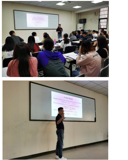 在学术报告中,吕自成教授首先提出了一个赌博机问题,引导在座的师生思考讨论,从而引出了本次报告的主要内容Multi-armed Bandit (MAB)问题。吕教授还借助药物临床试验、电商定价以及网络路由等实例,加深了大家对该问题的理解。通过进一步分析,吕自成教授指出MAB问题的两个关键属性分别是利用(exploitation)和探索(exploration),在设计算法时则需要考虑如何在这两者间取得平衡。接着吕自成教授列举了几种常用的bandit算法,如Epsilon-Greedy算法,Upper Confidence Bound (UCB)算法等。随后,吕教授还介绍了自己团队在该问题上的研究工作与科研成果。