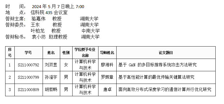 球王会(计算机科学系)2024年5月7日硕士答辩公告(第一批)