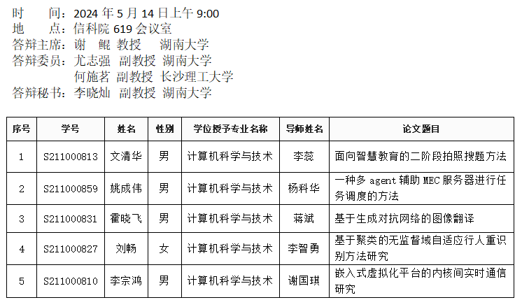 球王会(计算机工程系)2024年5月14日下午硕士答辩公告